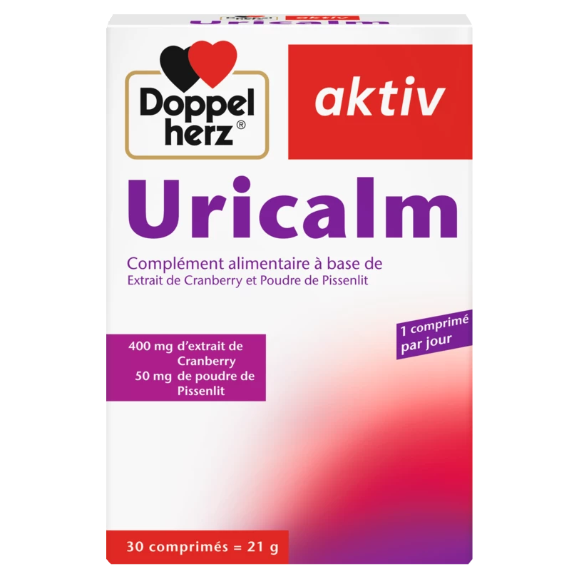 Doppelherz aktiv Uricalm est un complément alimentaire formulé pour favoriser le confort urinaire, particulièrement en cas de gêne fréquente ou de sensibilité de la sphère urinaire.